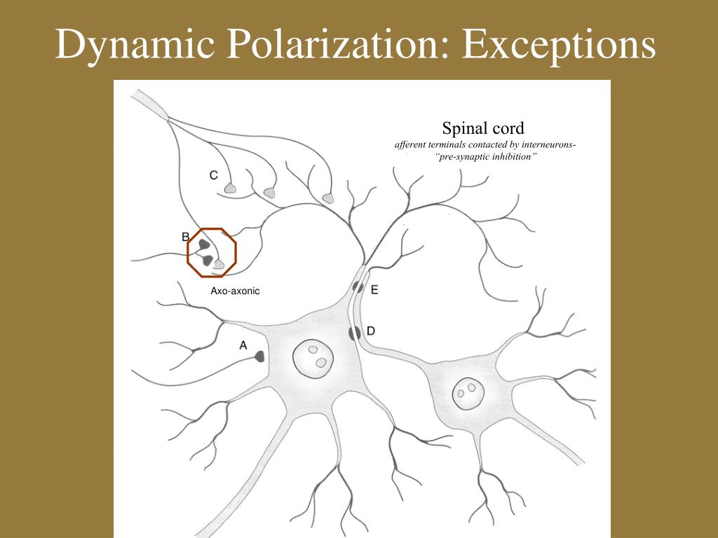 Dynamic Polarization: Exceptions Spinal cord afferent terminals contacted by interneurons- “pre-synaptic inhibition” Axo-axonic