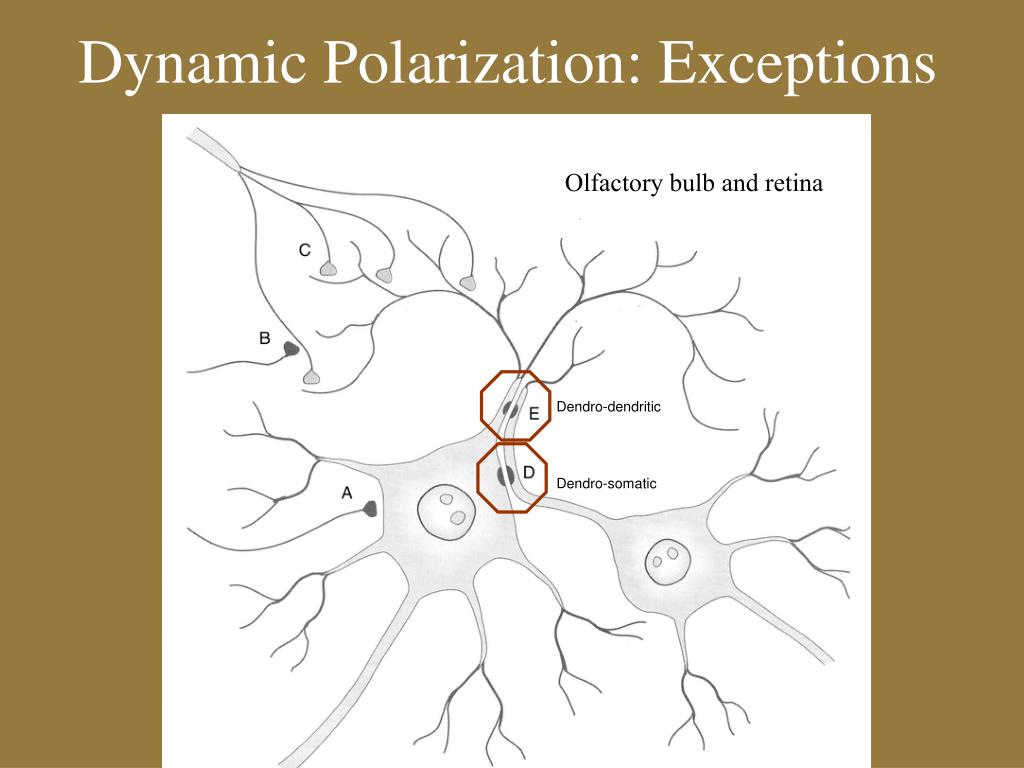Dynamic Polarization: Exceptions Olfactory bulb and retina Dendro-dendritic Dendro-somatic