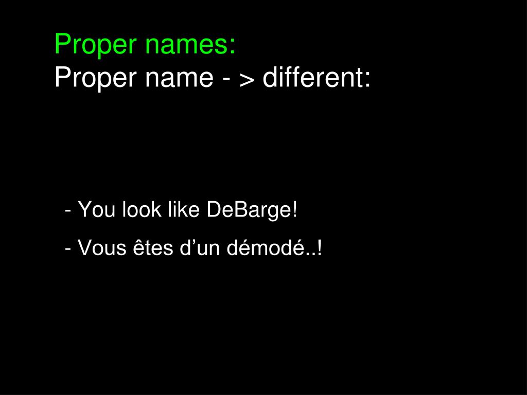 Proper names:Proper name - > different: - You look like DeBarge! - Vous êtes d’un démodé..!