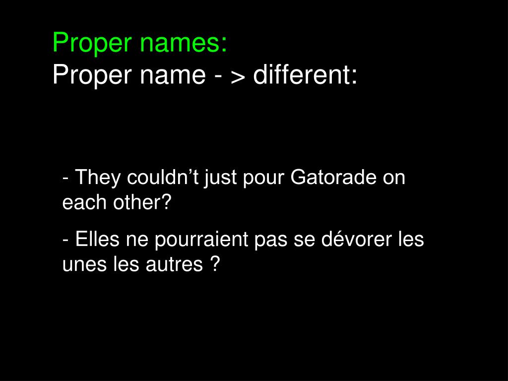 Proper names:Proper name - > different: - They couldn’t just pour Gatorade on each other? - Elles ne pourraient pas se dévorer les unes les autres ?