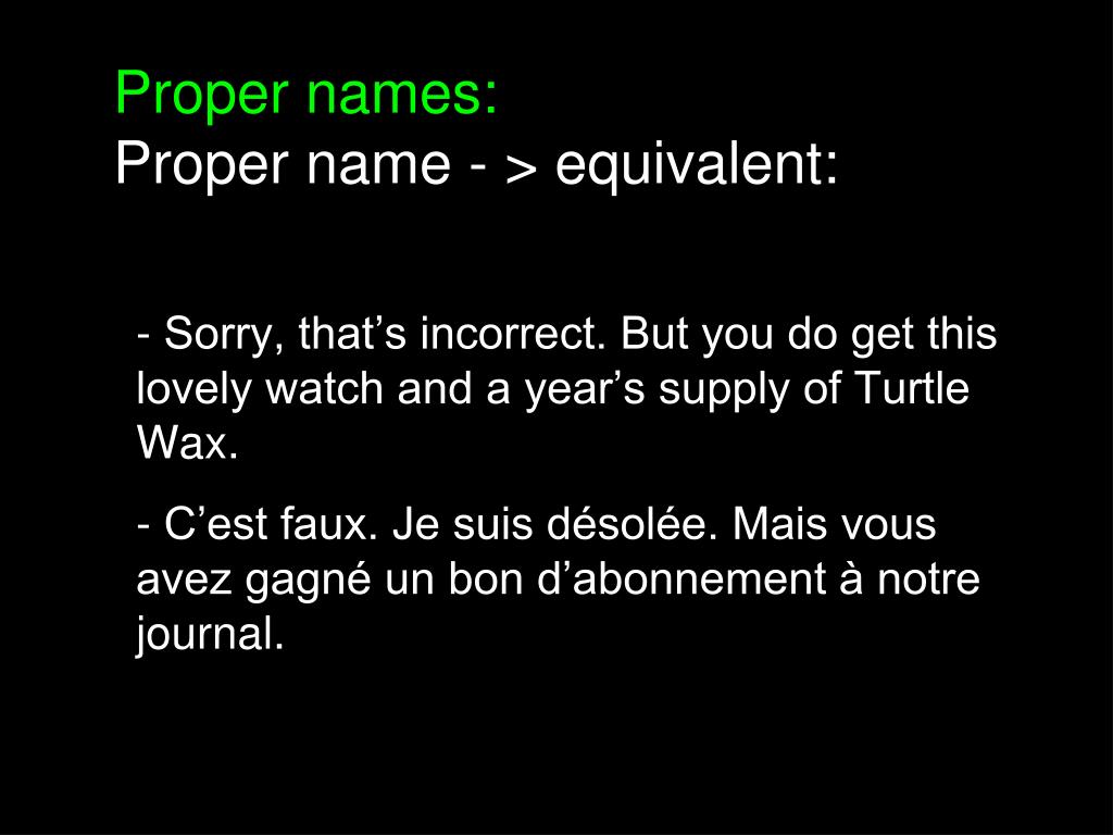 Proper names:Proper name - > equivalent: - Sorry, that’s incorrect. But you do get this lovely watch and a year’s supply of Turtle Wax. - C’est faux. Je suis désolée. Mais vous avez gagné un bon d’abonnement à notre journal.