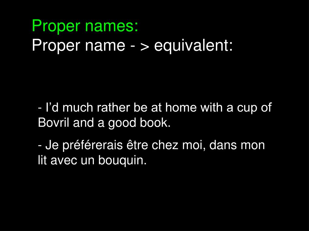 Proper names:Proper name - > equivalent: - I’d much rather be at home with a cup of Bovril and a good book. - Je préférerais être chez moi, dans mon lit avec un bouquin.
