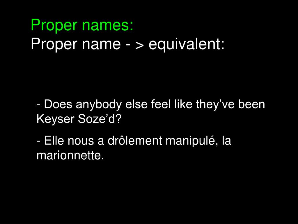 Proper names:Proper name - > equivalent: - Does anybody else feel like they’ve been Keyser Soze’d? - Elle nous a drôlement manipulé, la marionnette.
