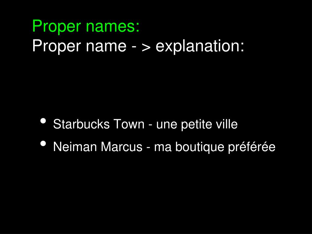 Proper names:Proper name - > explanation: • Starbucks Town - une petite ville • Neiman Marcus - ma boutique préférée
