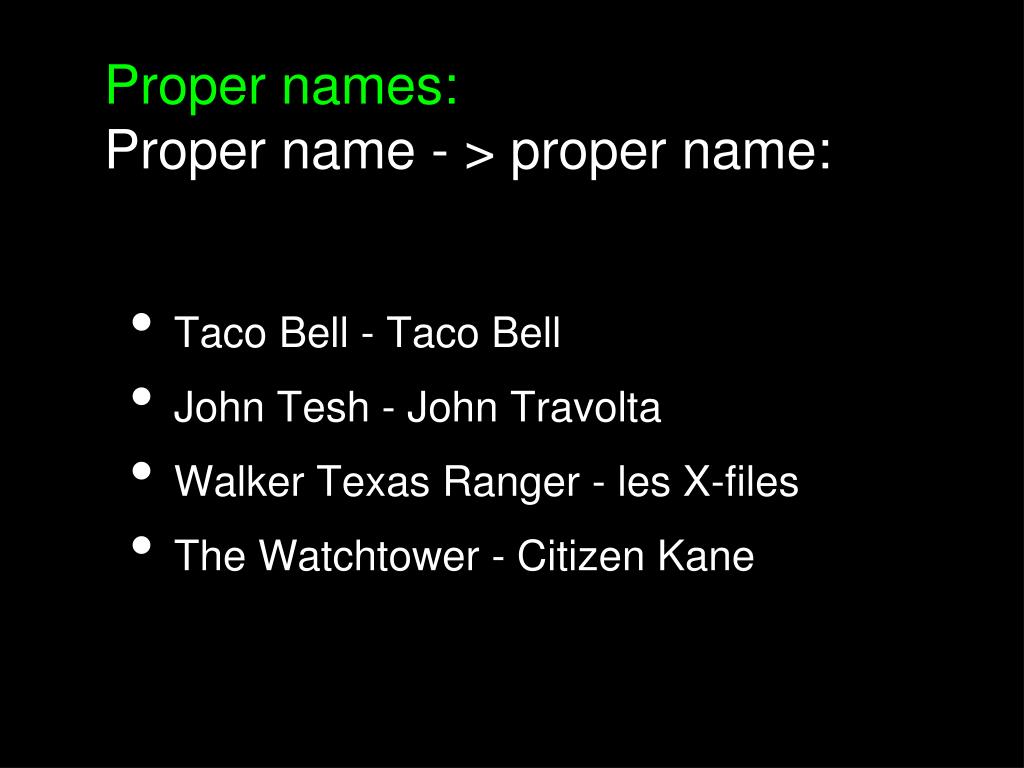 Proper names:Proper name - > proper name: • Taco Bell - Taco Bell • John Tesh - John Travolta • Walker Texas Ranger - les X-files • The Watchtower - Citizen Kane