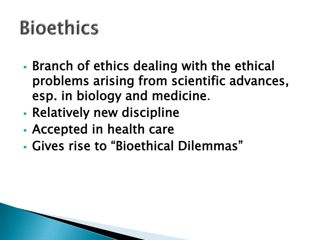 Bioethics • Branch of ethics dealing with the ethical problems arising from scientific advances, esp. in biology and medicine. • Relatively new discipline • Accepted in health care • Gives rise to “Bioethical Dilemmas”