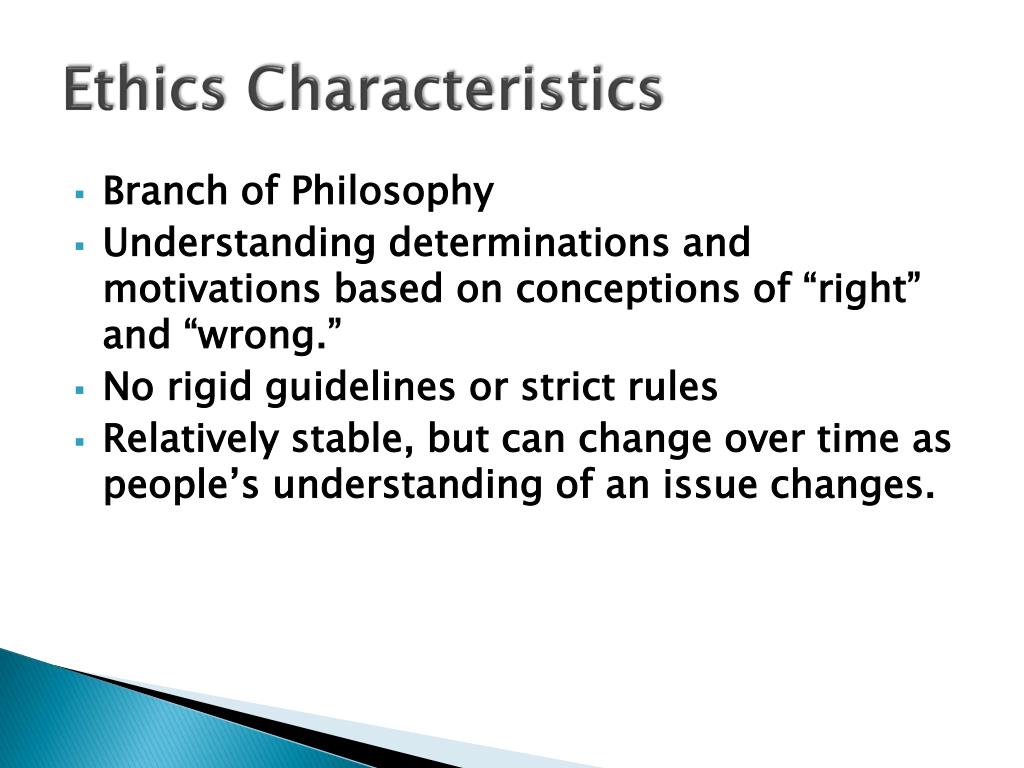 Ethics Characteristics • Branch of Philosophy • Understanding determinations and motivations based on conceptions of “right” and “wrong.” • No rigid guidelines or strict rules • Relatively stable, but can change over time as people’s understanding of an issue changes.