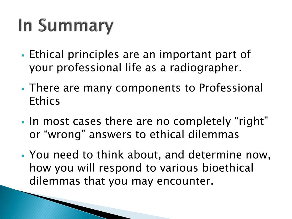 In Summary • Ethical principles are an important part of your professional life as a radiographer. • There are many components to Professional Ethics • In most cases there are no completely “right” or “wrong” answers to ethical dilemmas • You need to think about, and determine now, how you will respond to various bioethical dilemmas that you may encounter.