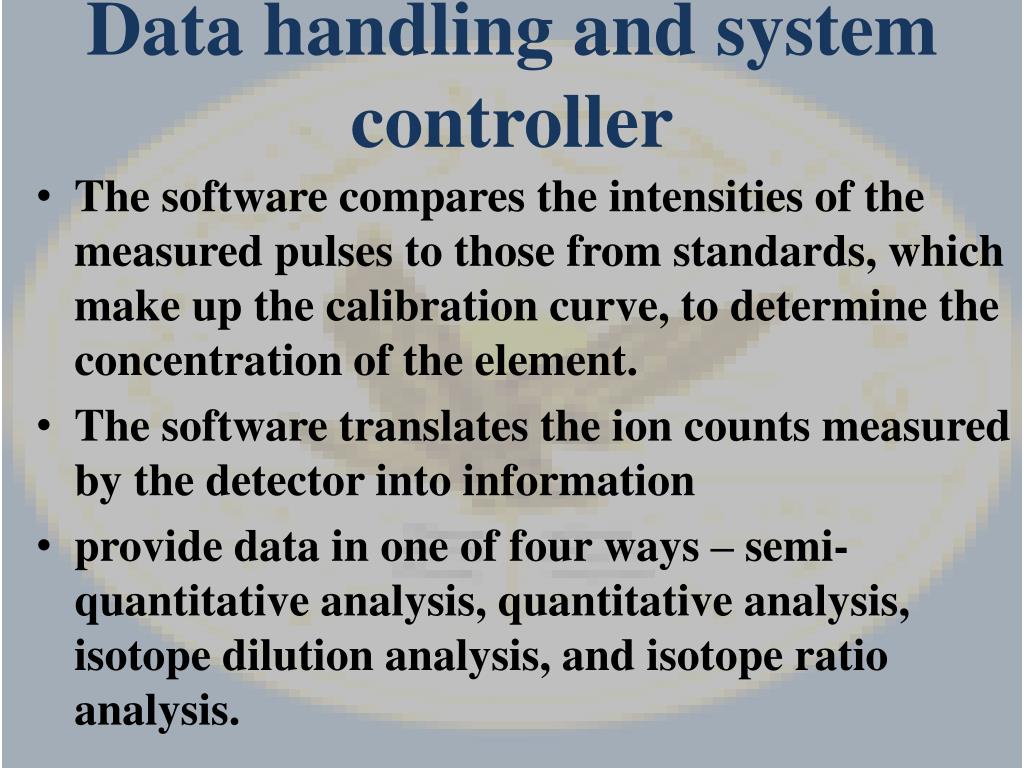Data handling and system controller • The software compares the intensities of the measured pulses to those from standards, which make up the calibration curve, to determine the concentration of the element. • The software translates the ion counts measured by the detector into information • provide data in one of four ways – semi-quantitative analysis, quantitative analysis, isotope dilution analysis, and isotope ratio analysis.