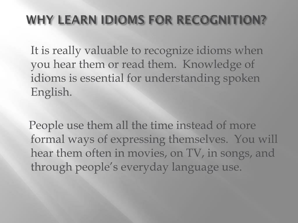 WHY LEARN IDIOMS FOR RECOGNITION? It is really valuable to recognize idioms when you hear them or read them. Knowledge of idioms is essential for understanding spoken English. People use them all the time instead of more formal ways of expressing themselves. You will hear them often in movies, on TV, in songs, and through people’s everyday language use.