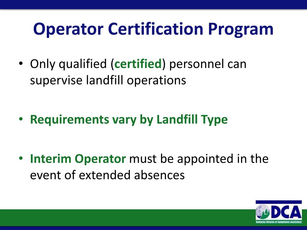 Operator Certification Program • Only qualified (certified) personnel can supervise landfill operations • Requirementsvary by Landfill Type • Interim Operator must be appointed in the event of extended absences