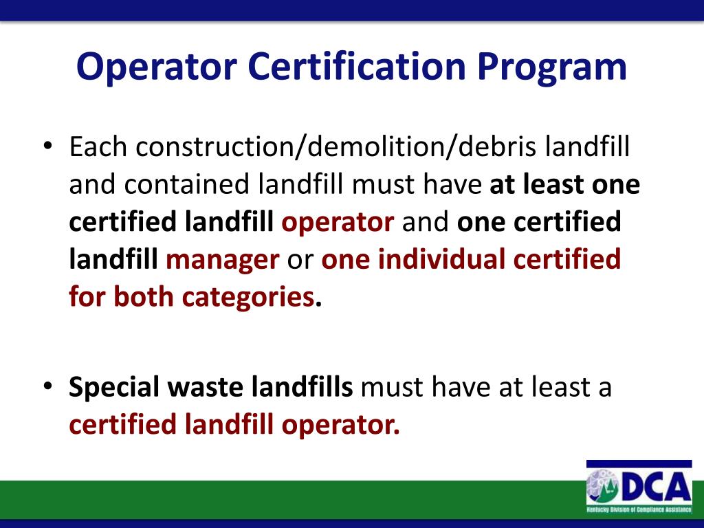 Operator Certification Program • Each construction/demolition/debris landfill and contained landfill must have at least one certified landfill operatorand one certified landfill manageror one individual certified for both categories. • Special waste landfills must have at least a certified landfill operator.