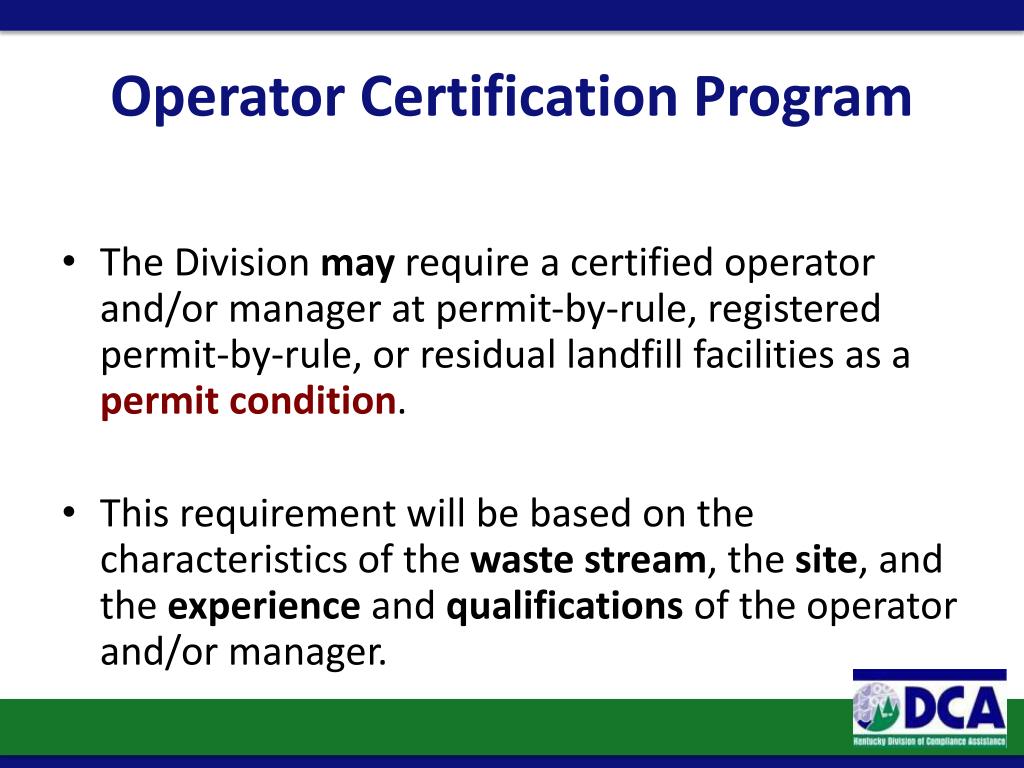 Operator Certification Program • The Division may require a certified operator and/or manager at permit-by-rule, registered permit-by-rule, or residual landfill facilities as a permit condition. • This requirement will be based on the characteristics of the waste stream, the site, and the experience and qualifications of the operator and/or manager.