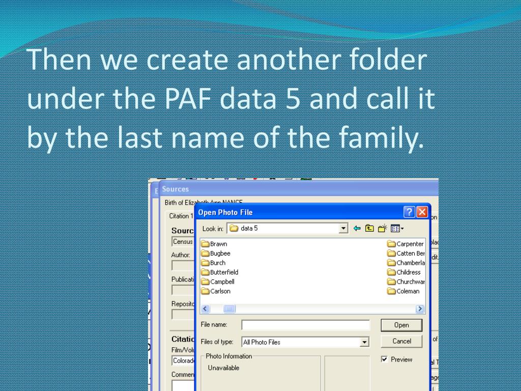 Then we create another folder under the PAF data 5 and call it by the last name of the family.