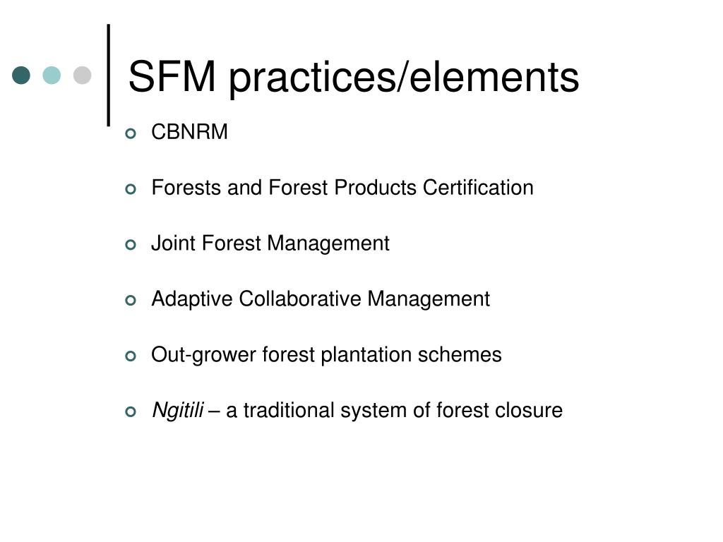 SFM practices/elements • CBNRM • Forests and Forest Products Certification • Joint Forest Management • Adaptive Collaborative Management • Out-grower forest plantation schemes • Ngitili – a traditional system of forest closure
