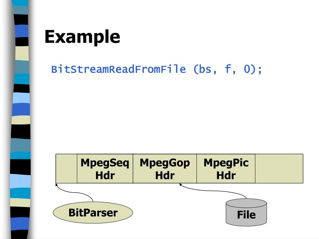 MpegSeqHdr MpegGopHdr MpegPicHdr Example BitStreamReadFromFile (bs, f, 0); BitStream File BitParser
