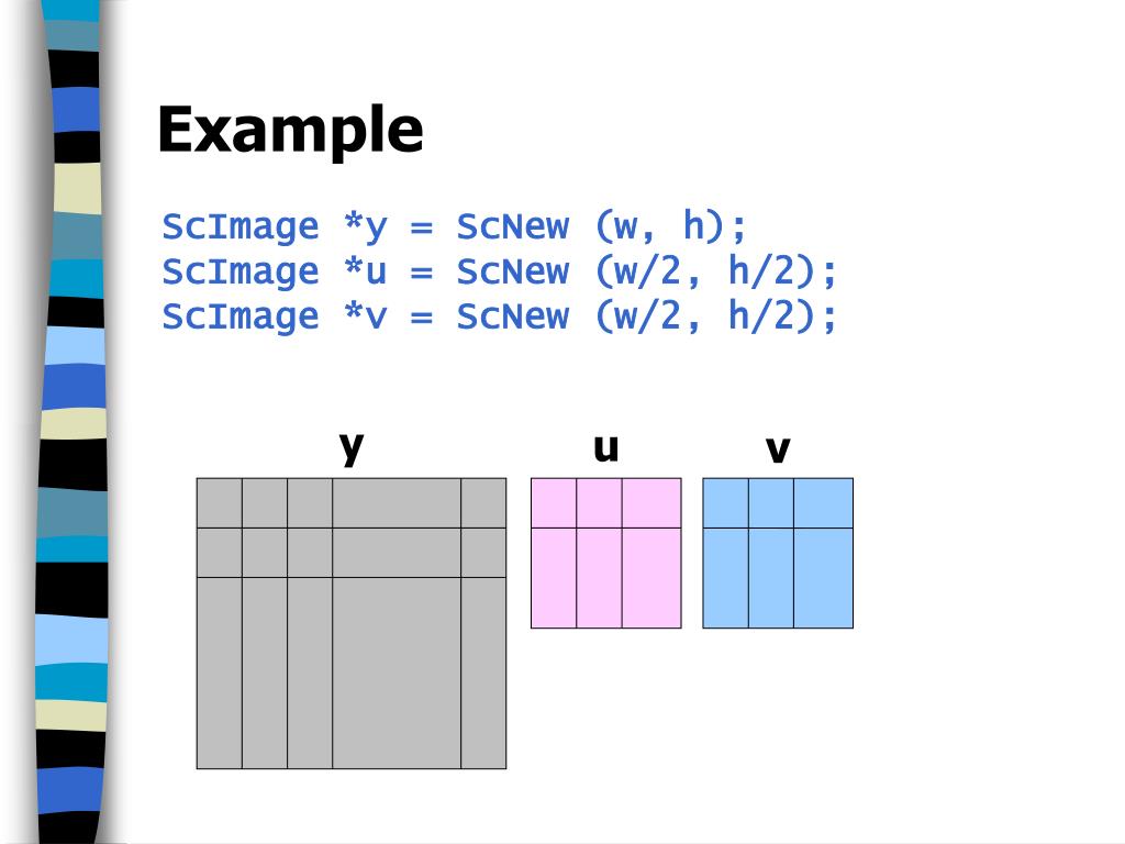 Example ScImage *y = ScNew (w, h); ScImage *u = ScNew (w/2, h/2); ScImage *v = ScNew (w/2, h/2); y u v