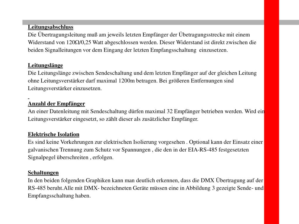 Leitungsabschluss • Die Übertragungsleitung muß am jeweils letzten Empfänger der Übetragungsstrecke mit einem • Widerstand von 120/0,25 Watt abgeschlossen werden. Dieser Widerstand ist direkt zwischen die • beiden Signalleitungen vor dem Eingang der letzten Empfangsschaltung einzusetzen. • Leitungslänge • Die Leitungslänge zwischen Sendeschaltung und dem letzten Empfänger auf der gleichen Leitung • ohne Leitungsverstärker darf maximal 1200m betragen. Bei größeren Entfernungen sind • Leitungsverstärker einzusetzen. • Anzahl der Empfänger • An einer Datenleitung mit Sendeschaltung dürfen maximal 32 Empfänger betrieben werden. Wird ein • Leitungsverstärker eingesetzt, so zählt dieser als zusätzlicher Empfänger. • Elektrische Isolation • Es sind keine Vorkehrungen zur elektrischen Isolierung vorgesehen . Optional kann der Einsatz einer • galvanischen Trennung zum Schutz vor Spannungen , die den in der EIA-RS-485 festgesetzten • Signalpegel überschreiten , erfolgen. • Schaltungen • In den beiden folgenden Graphiken kann man deutlich erkennen, dass die DMX Übertragung auf der • RS-485 beruht.Alle mit DMX- bezeichneten Geräte müssen eine in Abbildung 3 gezeigte Sende- und • Empfangsschaltung haben.