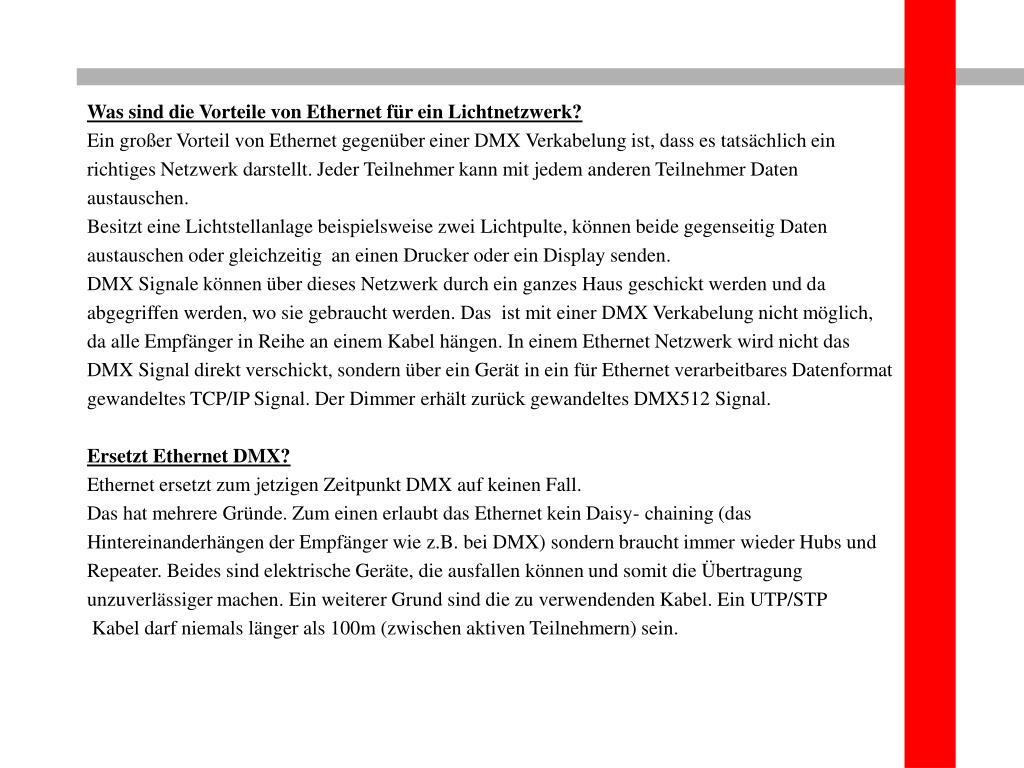 Was sind die Vorteile von Ethernet für ein Lichtnetzwerk? • Ein großer Vorteil von Ethernet gegenüber einer DMX Verkabelung ist, dass es tatsächlich ein • richtiges Netzwerk darstellt. Jeder Teilnehmer kann mit jedem anderen Teilnehmer Daten • austauschen. • Besitzt eine Lichtstellanlage beispielsweise zwei Lichtpulte, können beide gegenseitig Daten • austauschen oder gleichzeitig an einen Drucker oder ein Display senden. • DMX Signale können über dieses Netzwerk durch ein ganzes Haus geschickt werden und da • abgegriffen werden, wo sie gebraucht werden. Das ist mit einer DMX Verkabelung nicht möglich, • da alle Empfänger in Reihe an einem Kabel hängen. In einem Ethernet Netzwerk wird nicht das • DMX Signal direkt verschickt, sondern über ein Gerät in ein für Ethernet verarbeitbares Datenformat • gewandeltes TCP/IP Signal. Der Dimmer erhält zurück gewandeltes DMX512 Signal. • Ersetzt Ethernet DMX? • Ethernet ersetzt zum jetzigen Zeitpunkt DMX auf keinen Fall. • Das hat mehrere Gründe. Zum einen erlaubt das Ethernet kein Daisy- chaining (das • Hintereinanderhängen der Empfänger wie z.B. bei DMX) sondern braucht immer wieder Hubs und • Repeater. Beides sind elektrische Geräte, die ausfallen können und somit die Übertragung • unzuverlässiger machen. Ein weiterer Grund sind die zu verwendenden Kabel. Ein UTP/STP • Kabel darf niemals länger als 100m (zwischen aktiven Teilnehmern) sein.