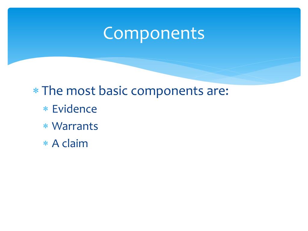 Components • The most basic components are: • Evidence • Warrants • A claim