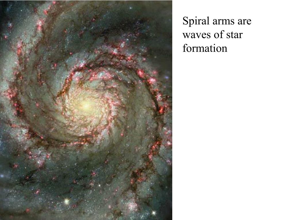 Spiral arms are waves of star formation • Gas clouds get squeezed as they move into spiral arms • Squeezing of clouds triggers star formation • Young stars flow out of spiral arms