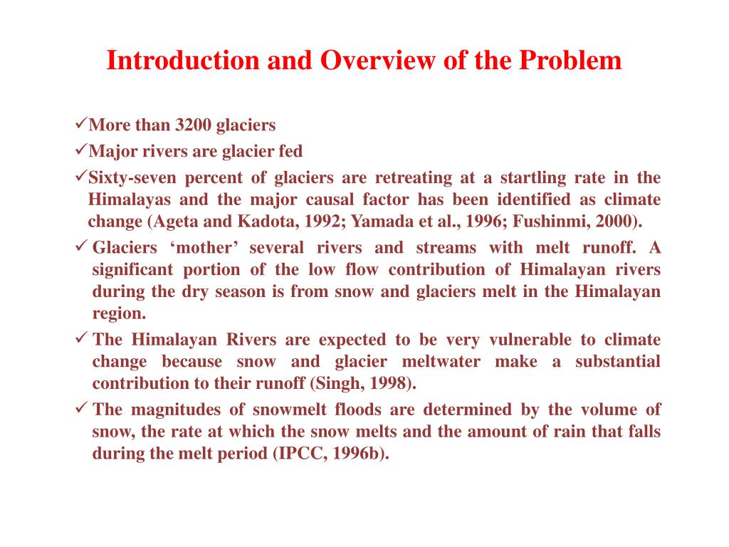 Introduction and Overview of the Problem More than 3200 glaciers Major rivers are glacier fed Sixty-seven percent of glaciers are retreating at a startling rate in the Himalayas and the major causal factor has been identified as climate change (Ageta and Kadota, 1992; Yamada et al., 1996; Fushinmi, 2000). Glaciers ‘mother’ several rivers and streams with melt runoff. A significant portion of the low flow contribution of Himalayan rivers during the dry season is from snow and glaciers melt in the Himalayan region. The Himalayan Rivers are expected to be very vulnerable to climate change because snow and glacier meltwater make a substantial contribution to their runoff (Singh, 1998). The magnitudes of snowmelt floods are determined by the volume of snow, the rate at which the snow melts and the amount of rain that falls during the melt period (IPCC, 1996b).