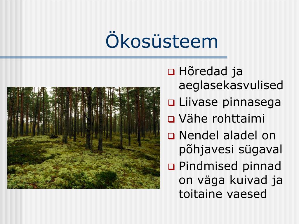 Ökosüsteem • Hõredad ja aeglasekasvulised • Liivase pinnasega • Vähe rohttaimi • Nendel aladel on põhjavesi sügaval • Pindmised pinnad on väga kuivad ja toitaine vaesed