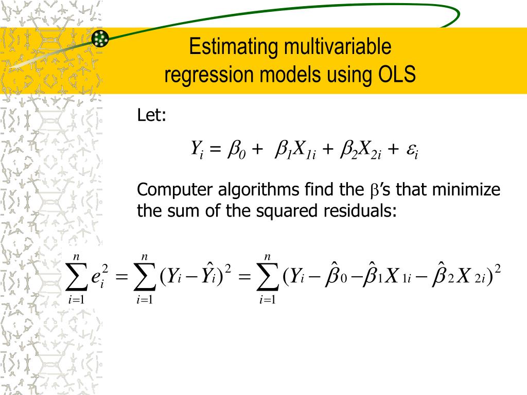 Estimating multivariable regression models using OLS Let: Yi = 0 + 1X1i+ 2X2i + i Computer algorithms find the ’s that minimize the sum of the squared residuals: