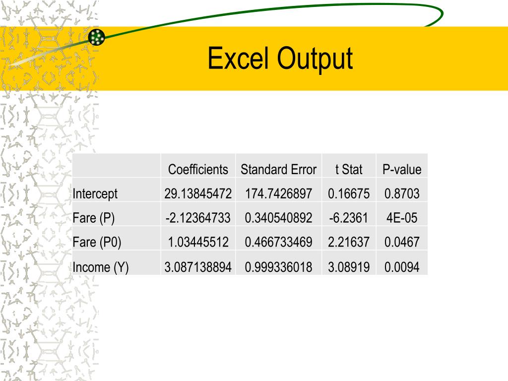 Effect of changes in the explanatory variables Q is the dependent variable; P, PO, and Y are the independent or explanatory variables. • For each one point increase in the income index (Y), 3 additional seats will be sold, ceteris paribus. • For each $10 increase in the airline’s fare, 20 fewer seats will be sold, ceteris paribus. • For each $10 increase in the competitor’s fare, 10 additional seats will be sold, ceteris paribus.