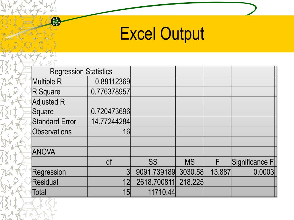 We set up the following null hypothesis an alternative hypothesis: H0 : 1 = 2 = 3 = 0 HA: H0 is not true We adhere to the following decision rule: Reject H0 if F > FC, where FC is the critical value of F at the level of significance selected by the forecaster. Suppose we select the 5 percent significance level. The critical value of F (3 degrees of freedom in the numerator and 12 degrees of freedom in the denominator) is 3.49. Thus we can reject the null hypothesis since 13.9 > 3.49.