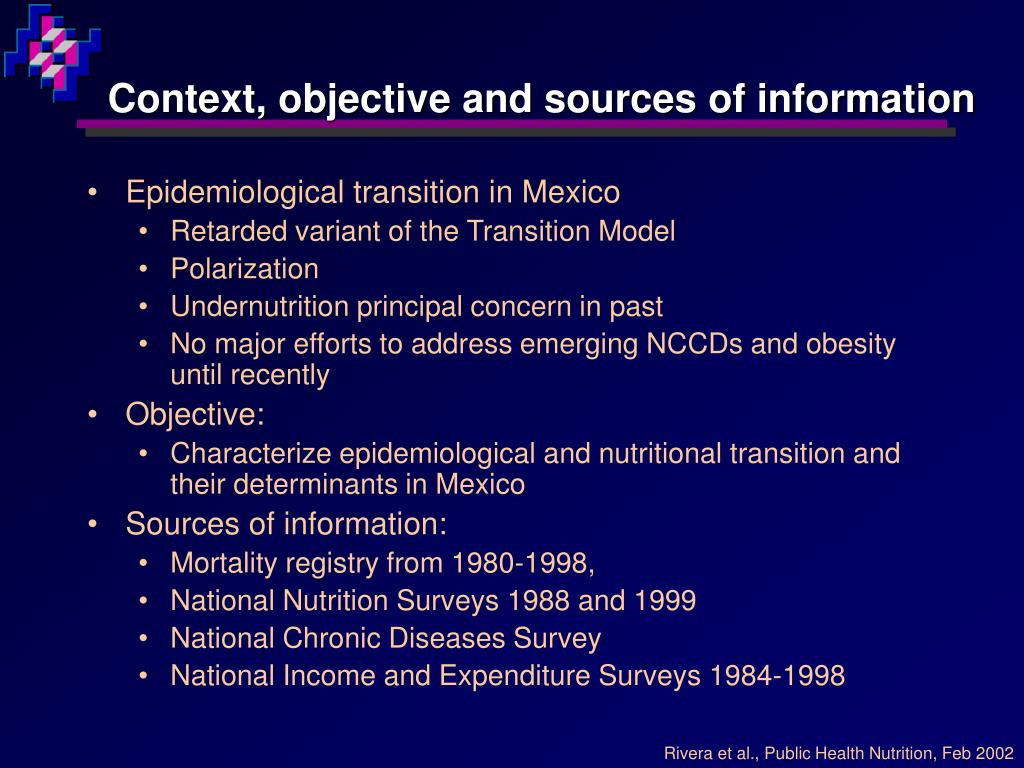Epidemiological transition in Mexico Retarded variant of the Transition Model Polarization Undernutrition principal concern in past No major efforts to address emerging NCCDs and obesity until recently Objective: Characterize epidemiological and nutritional transition and their determinants in Mexico Sources of information: Mortality registry from 1980-1998, National Nutrition Surveys 1988 and 1999 National Chronic Diseases Survey National Income and Expenditure Surveys 1984-1998 Context, objective and sources of information