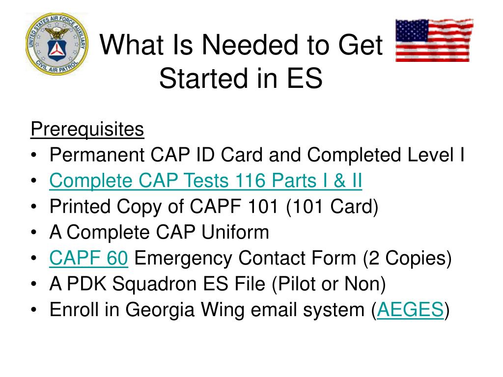 What Is Needed to Get Started in ES Prerequisites • Permanent CAP ID Card and Completed Level I • Complete CAP Tests 116 Parts I & II • Printed Copy of CAPF 101 (101 Card) • A Complete CAP Uniform • CAPF 60 Emergency Contact Form (2 Copies) • A PDK Squadron ES File (Pilot or Non) • Enroll in Georgia Wing email system (AEGES)