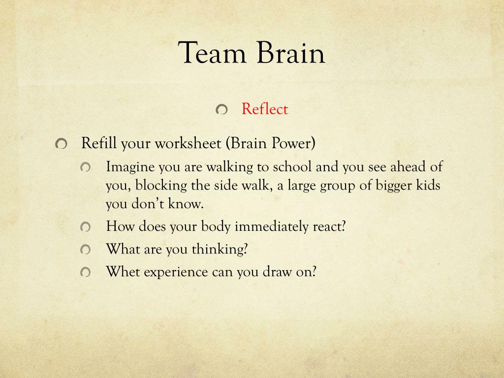 Team Brain • Reflect • Refill your worksheet (Brain Power) • Imagine you are walking to school and you see ahead of you, blocking the side walk, a large group of bigger kids you don’t know. • How does your body immediately react? • What are you thinking? • Whet experience can you draw on?