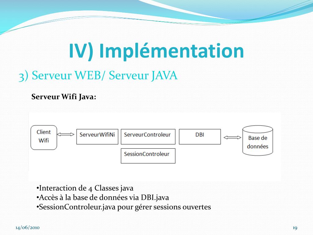 IV) Implémentation 3) Serveur WEB/ Serveur JAVA Serveur Wifi Java: • Interaction de 4 Classes java • Accès à la base de données via DBI.java • SessionControleur.java pour gérer sessions ouvertes
