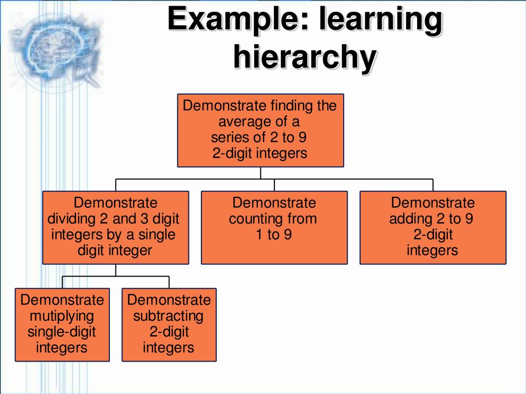 Learning Hierarchies • Essential prerequisites can be diagrammed as learning hierarchy • Indicates what competencies must be acquired • Results from task analysis, working backward from terminal objective to known (entry) skill • Basis for sequencing instruction
