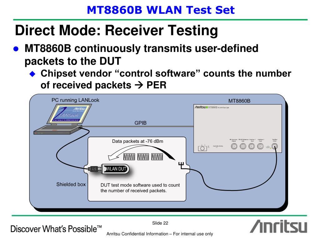 Direct Mode: Receiver Testing • MT8860B continuously transmits user-defined packets to the DUT • Chipset vendor “control software” counts the number of received packets PER Anritsu Confidential Information – For internal use only