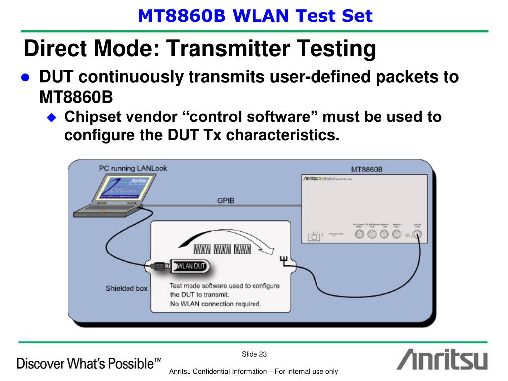 Direct Mode: Transmitter Testing • DUT continuously transmits user-defined packets to MT8860B • Chipset vendor “control software” must be used to configure the DUT Tx characteristics. Anritsu Confidential Information – For internal use only