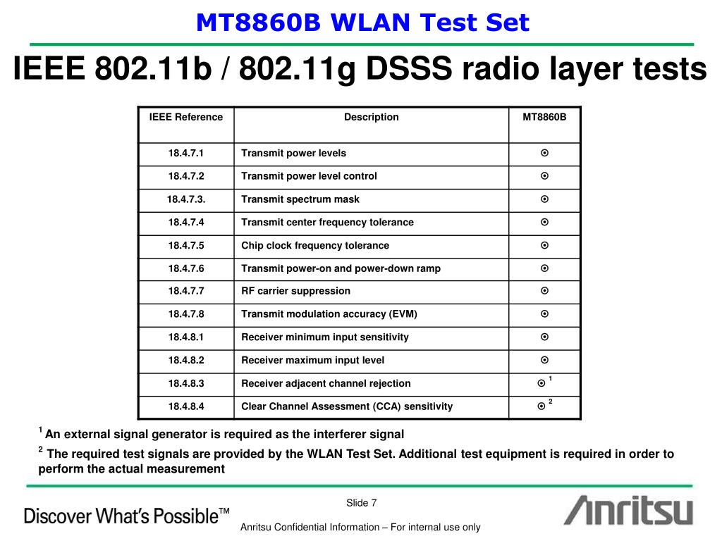 IEEE 802.11b / 802.11g DSSS radio layer tests 1 An external signal generator is required as the interferer signal 2The required test signals are provided by the WLAN Test Set. Additional test equipment is required in order to perform the actual measurement Anritsu Confidential Information – For internal use only