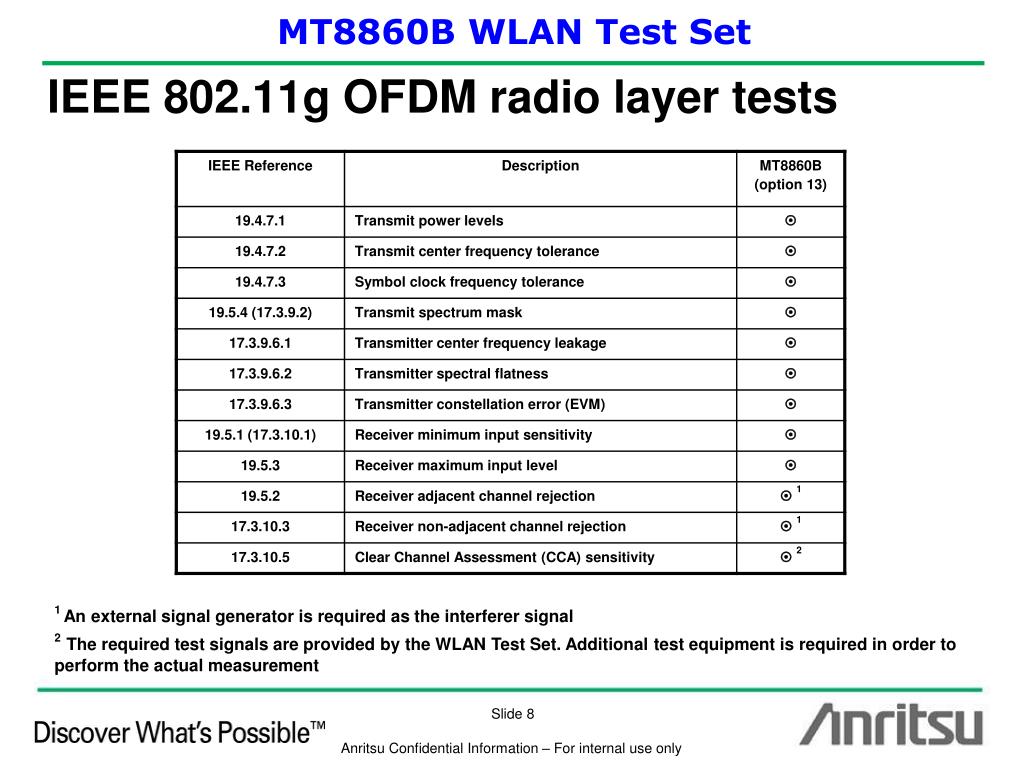 IEEE 802.11g OFDM radio layer tests 1 An external signal generator is required as the interferer signal 2The required test signals are provided by the WLAN Test Set. Additional test equipment is required in order to perform the actual measurement Anritsu Confidential Information – For internal use only