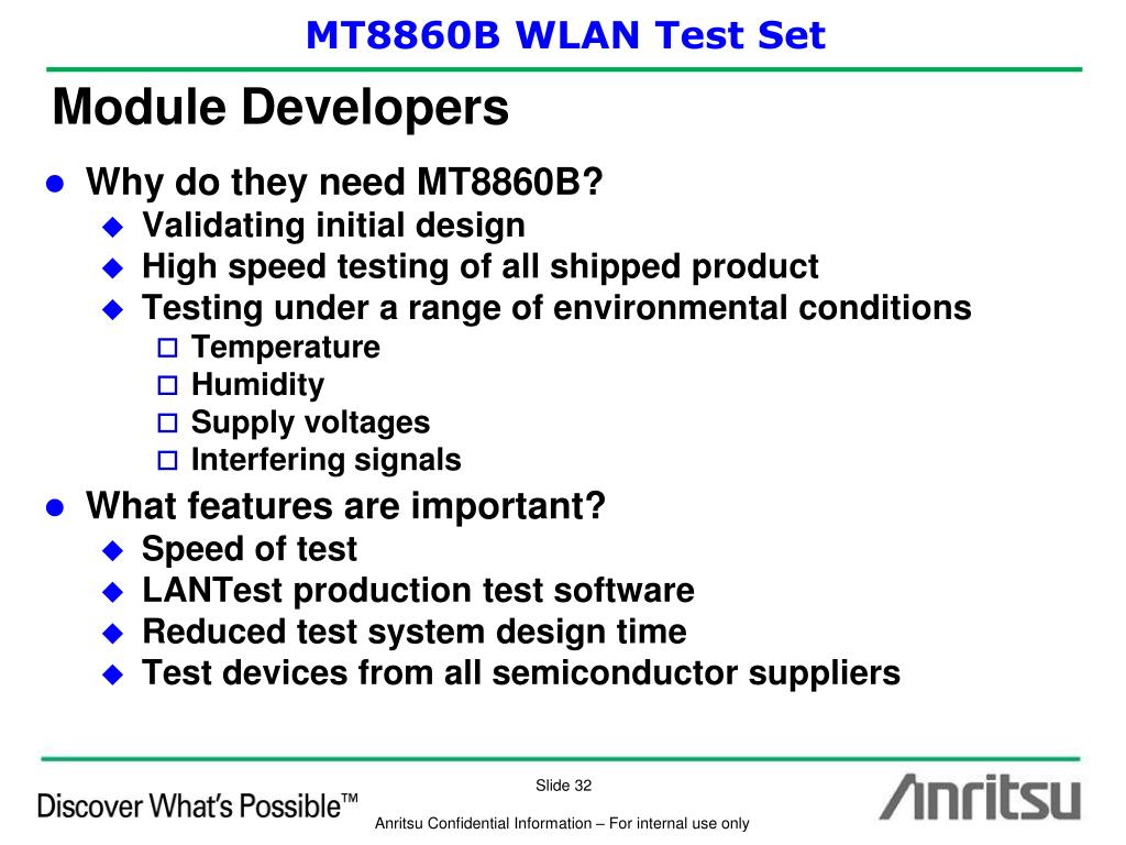 Module Developers • Why do they need MT8860B? • Validating initial design • High speed testing of all shipped product • Testing under a range of environmental conditions • Temperature • Humidity • Supply voltages • Interfering signals • What features are important? • Speed of test • LANTest production test software • Reduced test system design time • Test devices from all semiconductor suppliers Anritsu Confidential Information – For internal use only