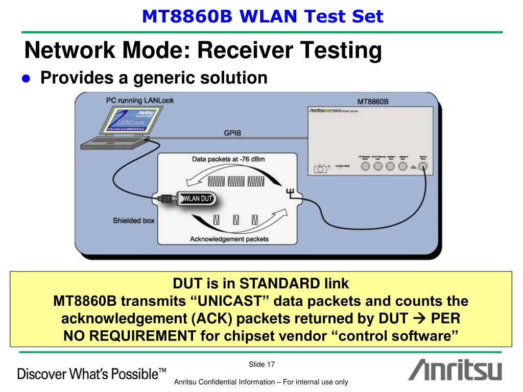 Network Mode: Receiver Testing • Provides a generic solution DUT is in STANDARD link MT8860B transmits “UNICAST” data packets and counts the acknowledgement (ACK) packets returned by DUT PER NO REQUIREMENT for chipset vendor “control software” Anritsu Confidential Information – For internal use only