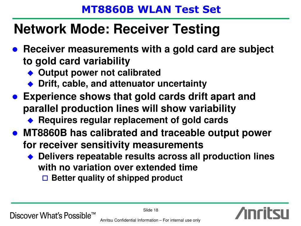 Network Mode: Receiver Testing • Receiver measurements with a gold card are subject to gold card variability • Output power not calibrated • Drift, cable, and attenuator uncertainty • Experience shows that gold cards drift apart and parallel production lines will show variability • Requires regular replacement of gold cards • MT8860B has calibrated and traceable output power for receiver sensitivity measurements • Delivers repeatable results across all production lines with no variation over extended time • Better quality of shipped product Anritsu Confidential Information – For internal use only