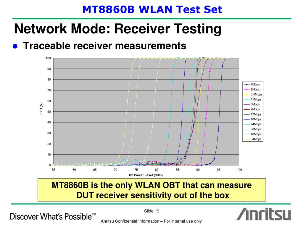 Network Mode: Receiver Testing • Traceable receiver measurements MT8860B is the only WLAN OBT that can measure DUT receiver sensitivity out of the box Anritsu Confidential Information – For internal use only