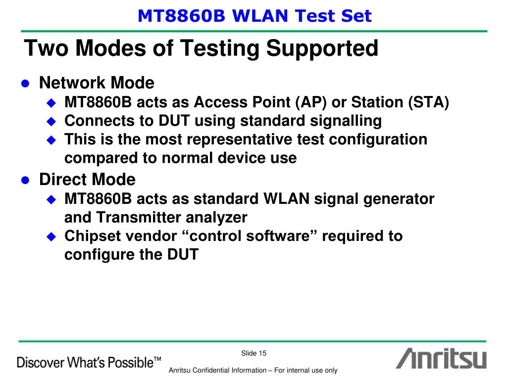 Two Modes of Testing Supported • Network Mode • MT8860B acts as Access Point (AP) or Station (STA) • Connects to DUT using standard signalling • This is the most representative test configuration compared to normal device use • Direct Mode • MT8860B acts as standard WLAN signal generator and Transmitter analyzer • Chipset vendor “control software” required to configure the DUT Anritsu Confidential Information – For internal use only