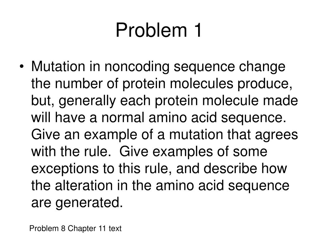 Problem 1 • Mutation in noncoding sequence change the number of protein molecules produce, but, generally each protein molecule made will have a normal amino acid sequence. Give an example of a mutation that agrees with the rule. Give examples of some exceptions to this rule, and describe how the alteration in the amino acid sequence are generated. Problem 8 Chapter 11 text