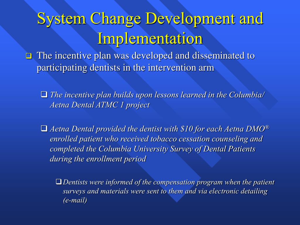 System Change Development and Implementation • The incentive plan was developed and disseminated to participating dentists in the intervention arm • The incentive plan builds upon lessons learned in the Columbia/ Aetna Dental ATMC 1 project • Aetna Dental provided the dentist with $10 for each Aetna DMO® enrolled patient who received tobacco cessation counseling and completed the Columbia University Survey of Dental Patients during the enrollment period • Dentists were informed of the compensation program when the patient surveys and materials were sent to them and via electronic detailing (e-mail)