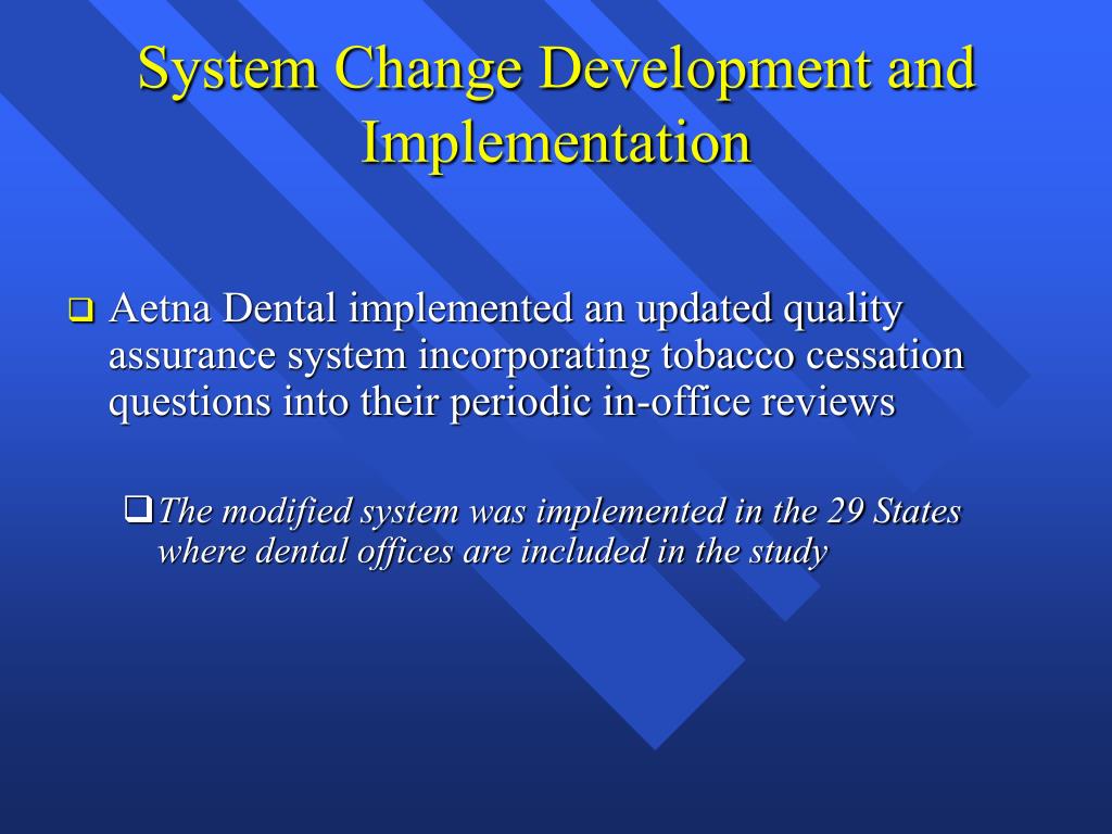 System Change Development and Implementation • Aetna Dental implemented an updated quality assurance system incorporating tobacco cessation questions into their periodic in-office reviews • The modified system was implemented in the 29 States where dental offices are included in the study
