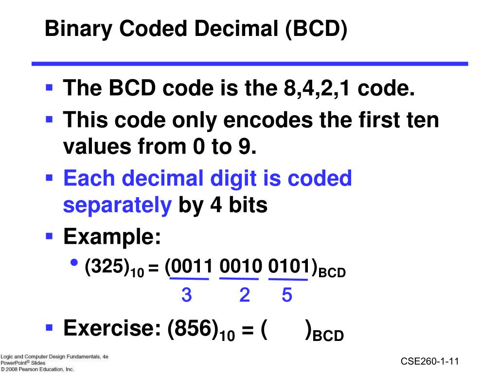 Binary Coded Decimal (BCD) • The BCD code is the 8,4,2,1 code. • This code only encodes the first ten values from 0 to 9. • Each decimal digit is coded separately by 4 bits • Example: • (325)10= (0011 0010 0101)BCD • Exercise: (856)10 = ( )BCD 3 2 5