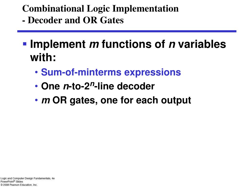 Combinational Logic Implementation- Decoder and OR Gates • Implement m functions of n variables with: • Sum-of-minterms expressions • One n-to-2n-line decoder • mOR gates, one for each output