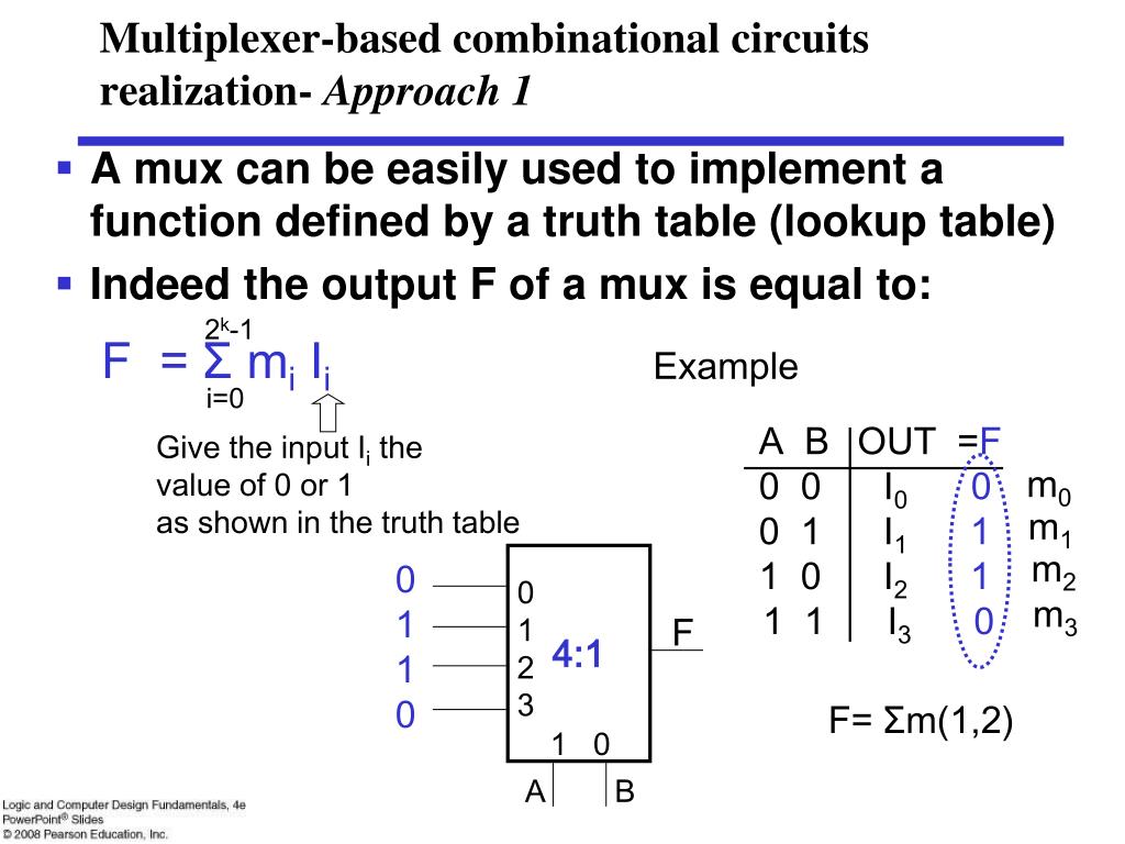 Multiplexer-based combinational circuitsrealization- Approach 1 4:1 0 1 2 3 F 1 0 Example m0 m1 A B OUT =F 0 0 I0 0 0 1 I11 1 0 I21 1 1 I30 2k-1 m2 F = Σmi Ii m3 i=0 F= Σm(1,2) • A mux can be easily used to implement a function defined by a truth table (lookup table) • Indeed the output F of a mux is equal to: Give the input Ii the value of 0 or 1 as shown in the truth table 0 1 1 0 A B